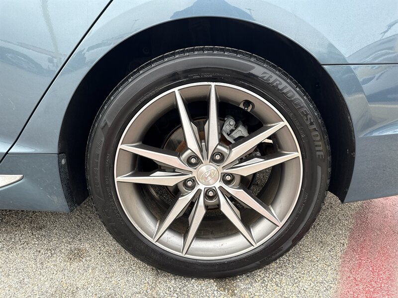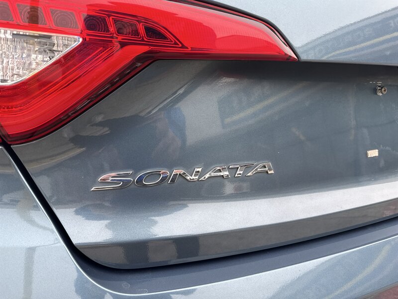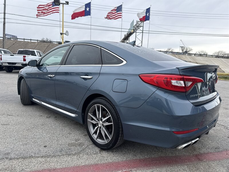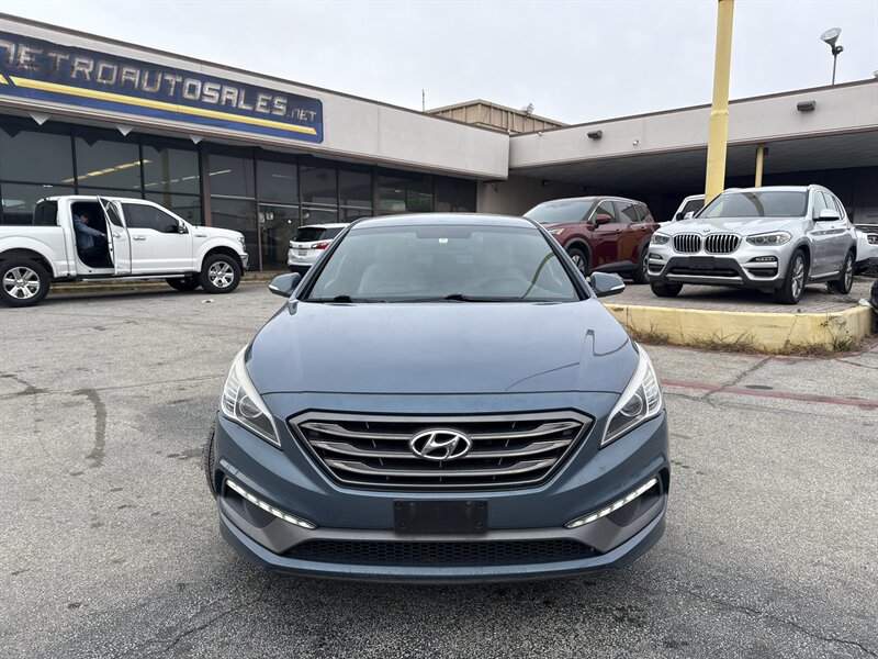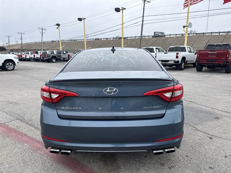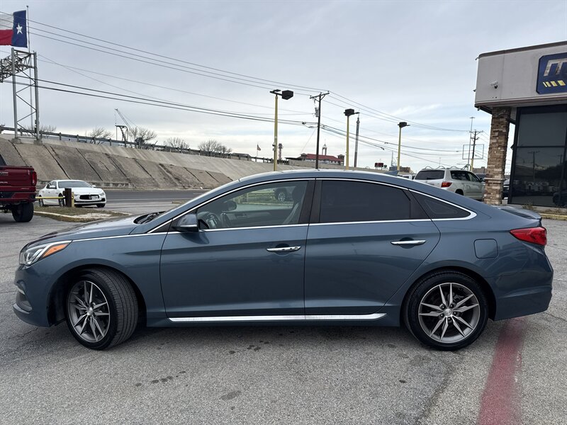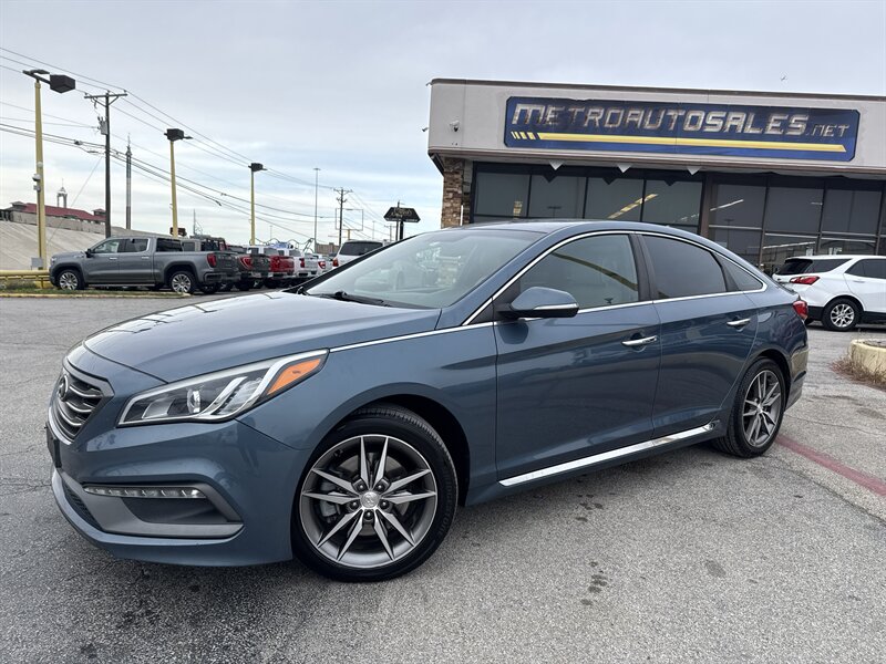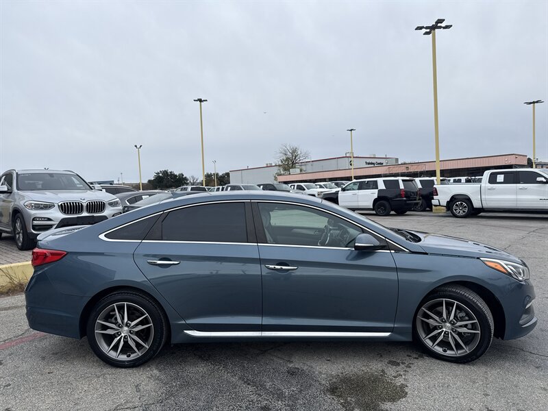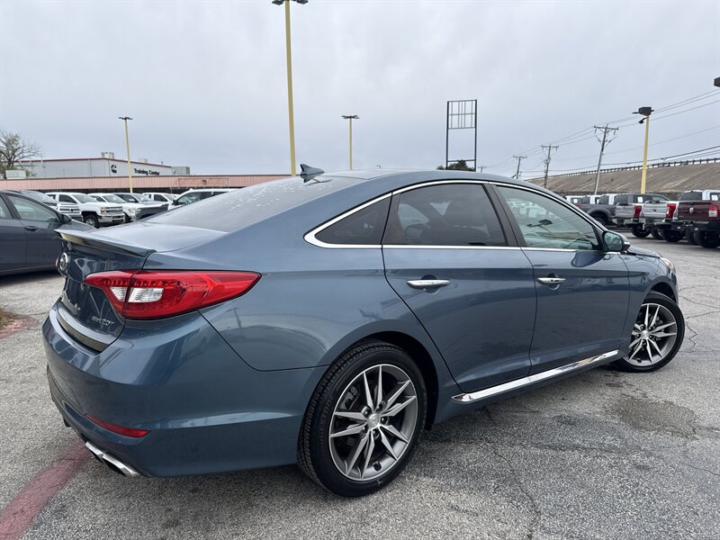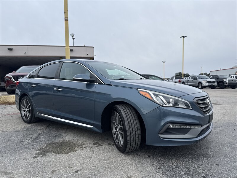 2015 Hyundai Sonata Sport 2.0T — Lakeside Blue exterior, Gray interior. Powered by the Theta II 2.0L turbocharged inline-4 producing 245 hp and 260 lb-ft of torque. EPA-rated at 23 MPG city and 32 MPG highway. Excellent overall condition with a clean CARFAX.
