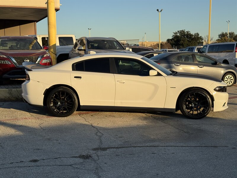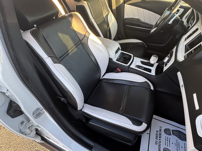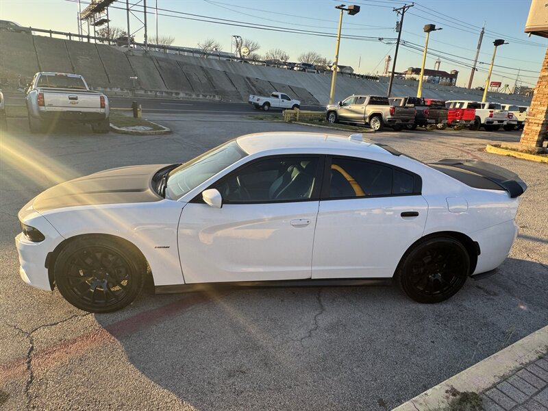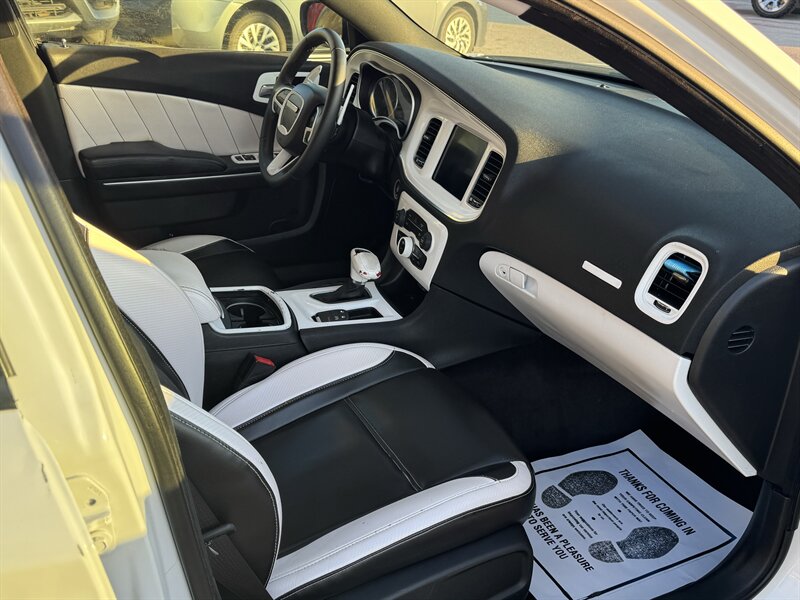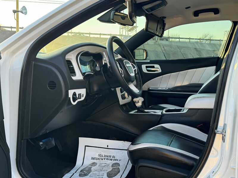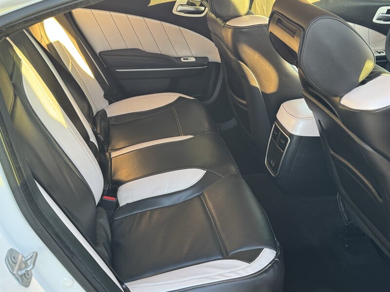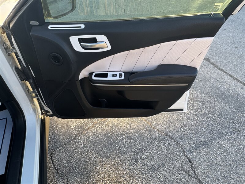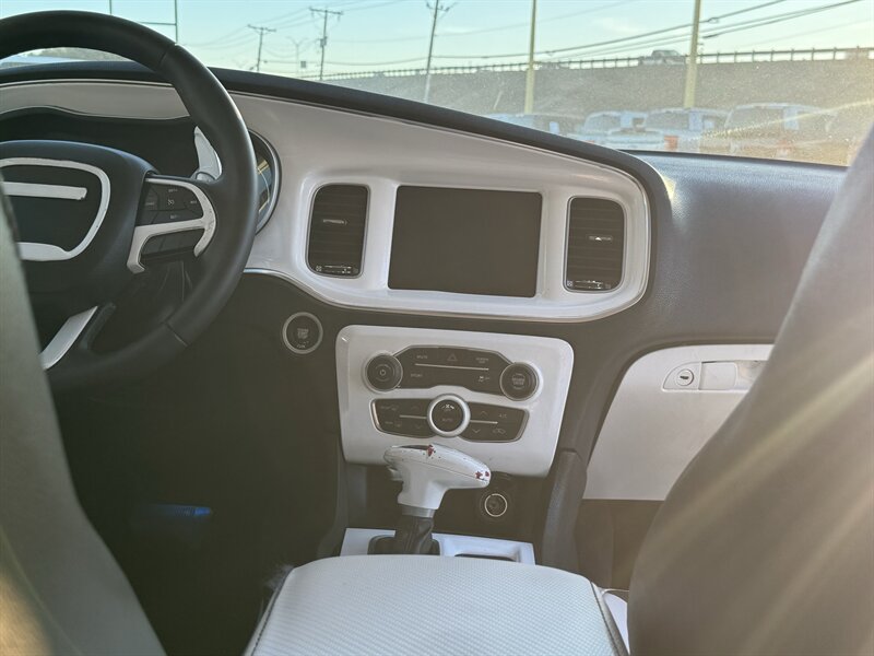 This 2017 Dodge Charger R/T is equipped with a powerful HEMI 5.7L V8 engine that delivers 370hp and 395ft. lbs. of torque, providing an exhilarating driving experience. It comes with desirable packages such as the Blacktop Package, Navigation and Rear Back Up Camera Group, and Premium Group, enhancing both performance and convenience. The factory default features of this Charger R/T include advanced technologies such as a user-friendly infotainment system, Bluetooth connectivity, dual-zone automatic climate control, and a 7-inch touchscreen display. Safety features like traction control, stability control, and multiple airbags ensure peace of mind on the road. In terms of optional features, this Charger R/T is equipped with the Beats Audio Group for premium sound quality, luxurious Nappa Leather Sport Seats for added comfort, and stylish 20 x 8.0-inch Aluminum Hyperblack Wheels that complement the vehicle's sporty design. The exterior is finished in a sleek White Knuckle Clear Coat, while the interior boasts a sophisticated Black color scheme. With a fuel efficiency of 16 MPG in the city and 25 MPG on the highway, this Charger R/T offers a balance of performance and economy. In excellent overall condition, this vehicle is a compelling choice for those seeking a blend of power, style, and modern features in a sedan.